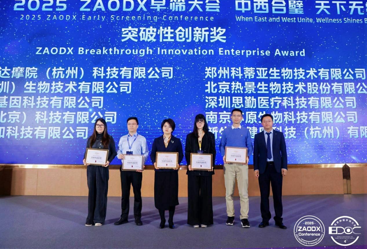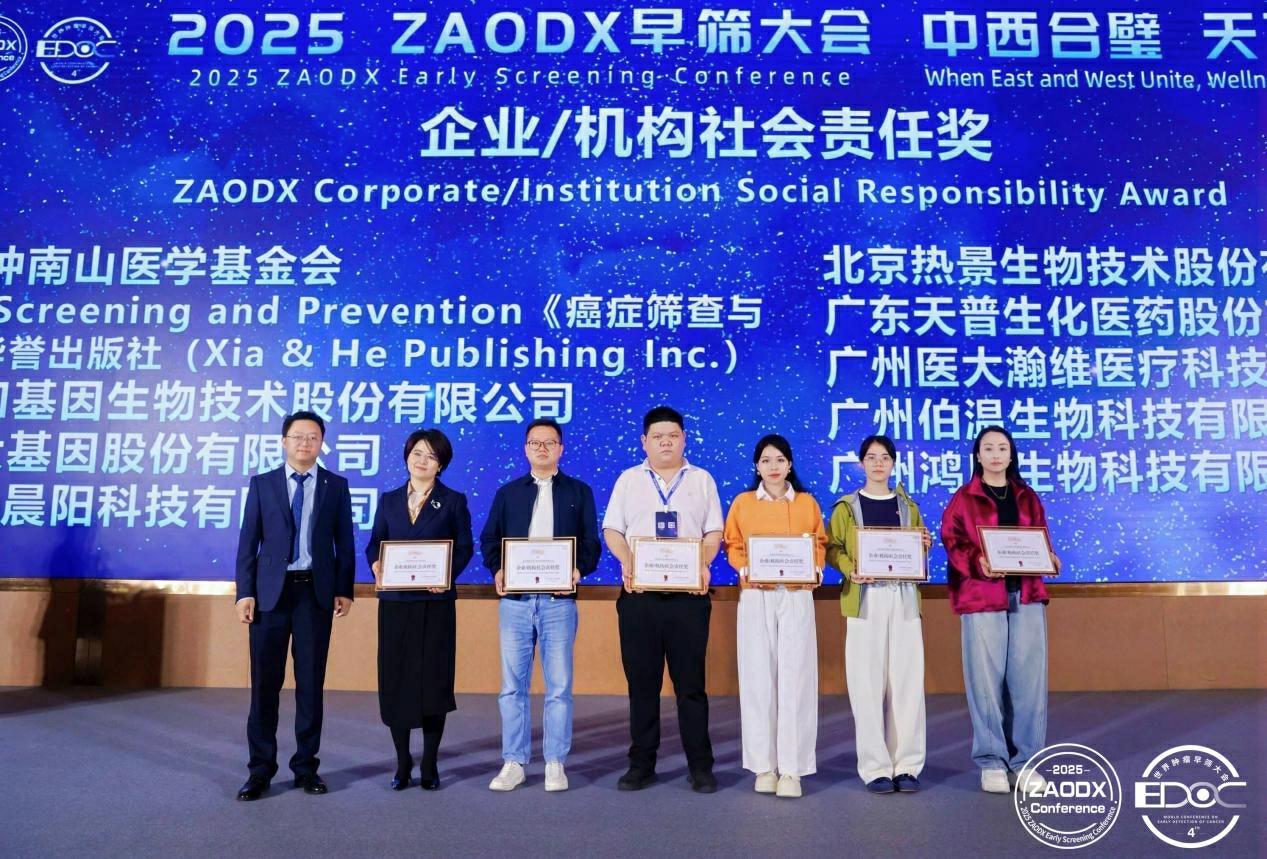 12月20日-21日,以“中西合璧,天下無疾”為主題的“2025 ZAODX早篩大會”在廣州舉辦。會議期間,主辦方公布了第四屆“金篩獎”榜單,并舉行線下頒獎儀式。熱景生物憑借“C-GALAD肝癌風險預警模型”的創新性以及“肝癌早篩健康中國行”公益項目的巨大社會和經濟價值分別榮獲“突破性創新獎”與“企業/機構社會責任獎”。一次斬獲兩項行業榮譽,體現了業界對公司在肝癌早篩領域技術創新與社會貢獻的充分肯定。